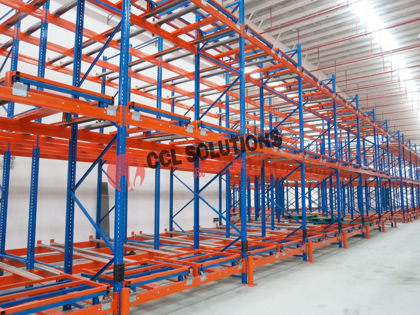 后推式货架又名压入式货架——是在前后梁间以多层台车重叠相接,从外侧将叠栈货物置于台车推入,后储存之货品会将原先货品推往里面。